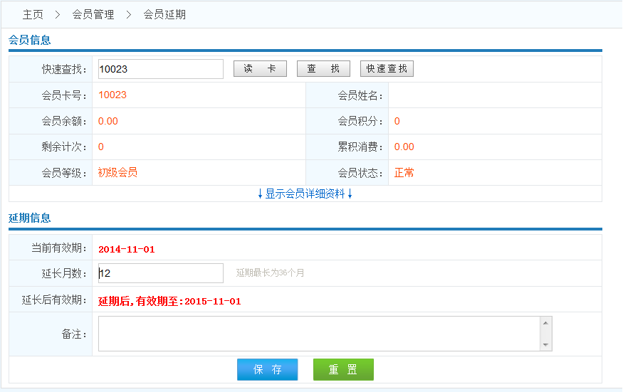 當(dāng)會(huì)員卡快到期或者已經(jīng)過期時(shí)可以為會(huì)員進(jìn)行延期操作,延期以月為單位,相關(guān)操作如下.