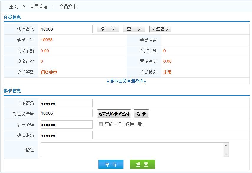 1.當(dāng)會(huì)員卡消磁,損壞,或者遺失的時(shí)候,商家可以為會(huì)員進(jìn)行換卡操作,在換卡操作后,系統(tǒng)自動(dòng)將該會(huì)員原始數(shù)據(jù)同步到新的會(huì)員卡信息內(nèi).