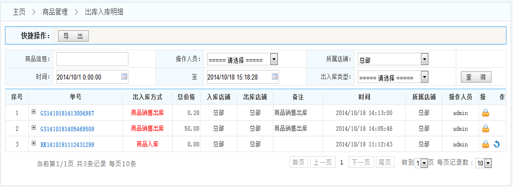 出庫(kù)入庫(kù)明細(xì):點(diǎn)擊進(jìn)入出庫(kù)入庫(kù)明細(xì)界面 如下圖: 此界面顯示出庫(kù)入庫(kù)的明細(xì)數(shù)據(jù),支持按訂單號(hào)/商品名稱快速查找,按時(shí)間范圍、操作員、所屬店鋪過(guò)濾條件查找
