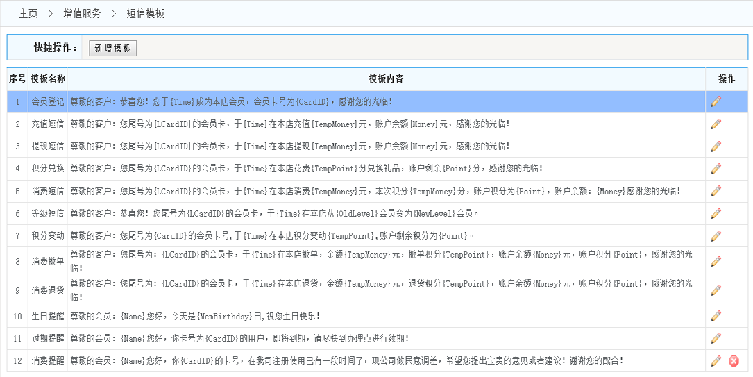 系統(tǒng)模版:    一到十一為系統(tǒng)內(nèi)置模板只可以修改不可以刪除(包含積分變動、等級短信、消費(fèi)短信、積分兌換、提現(xiàn)短信、充值短信、會員登記;)十二以后為用戶自定義短信模板,可編寫,可刪除